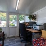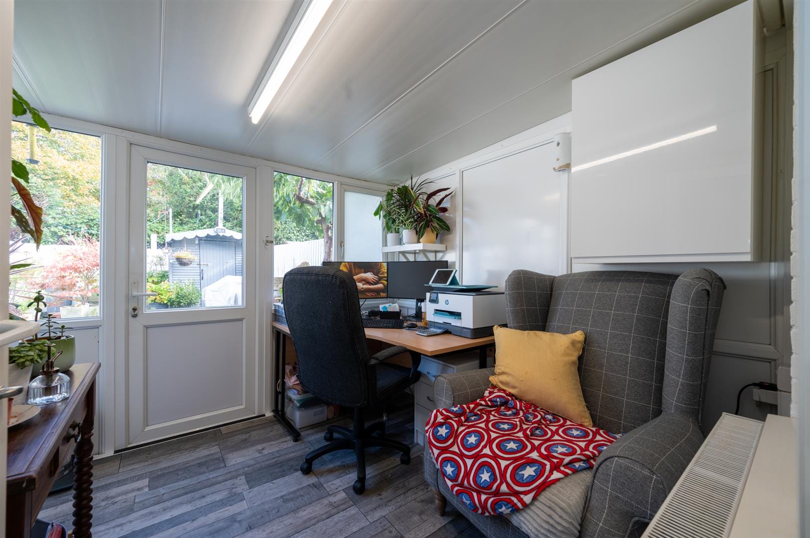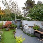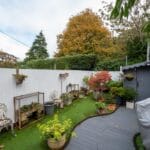 The garden is low maintenance, laid with artificial grass and includes a wooden shed for storage.