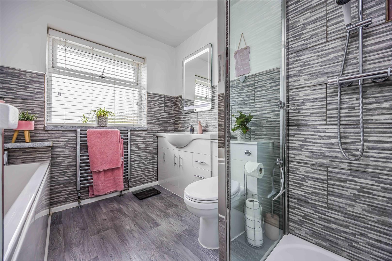 On the first floor, you will find three generously sized double bedrooms, all featuring high-quality decor. Bedrooms one and two come with built-in wardrobes and overlook the garden through rear aspect windows, while bedroom three offers a spacious over-stair storage cupboard. The stylish family bathroom is equipped with both a bath and a separate shower, along with a vanity unit basin and WC.