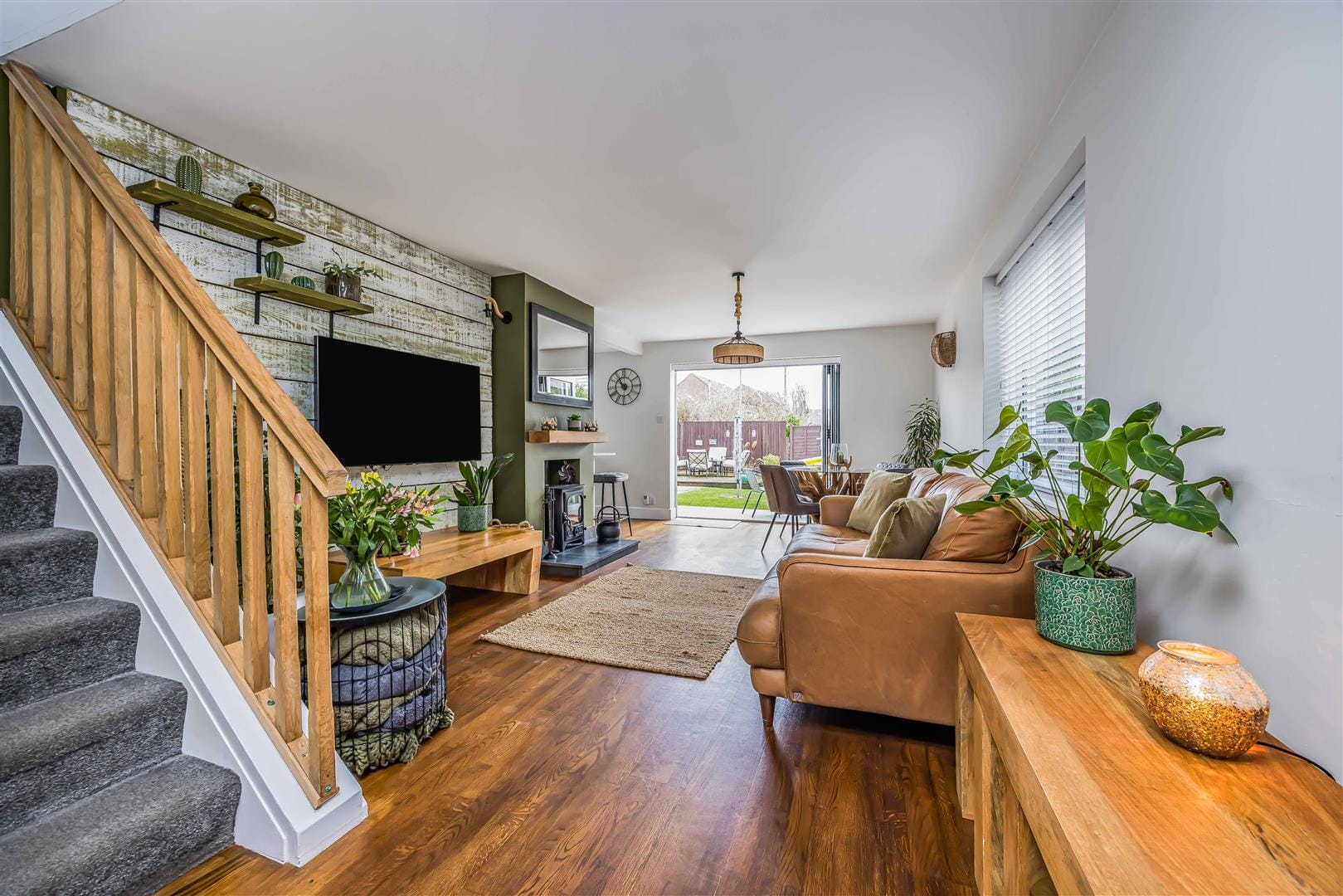 The property welcomes you with an inviting entrance porch that leads into a spacious living area. The open-plan lounge and dining room create an ideal setting for entertaining, featuring a charming log burner that serves as the room's centerpiece. Bi-folding patio doors with a remote controlled blind seamlessly connect the indoor and outdoor spaces, opening onto a beautifully landscaped garden. The modern fitted kitchen boasts a sleek finish, ample cupboard space, and integrated appliances. Additionally, there is a utility room with side door access and a downstairs toilet. Bedroom four, located on the ground floor, is versatile and can be used as an office, playroom, or cozy snug lounge.
