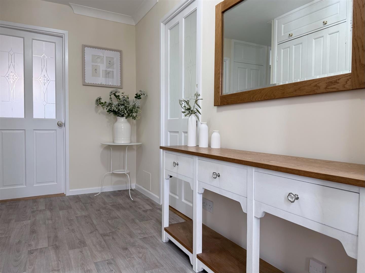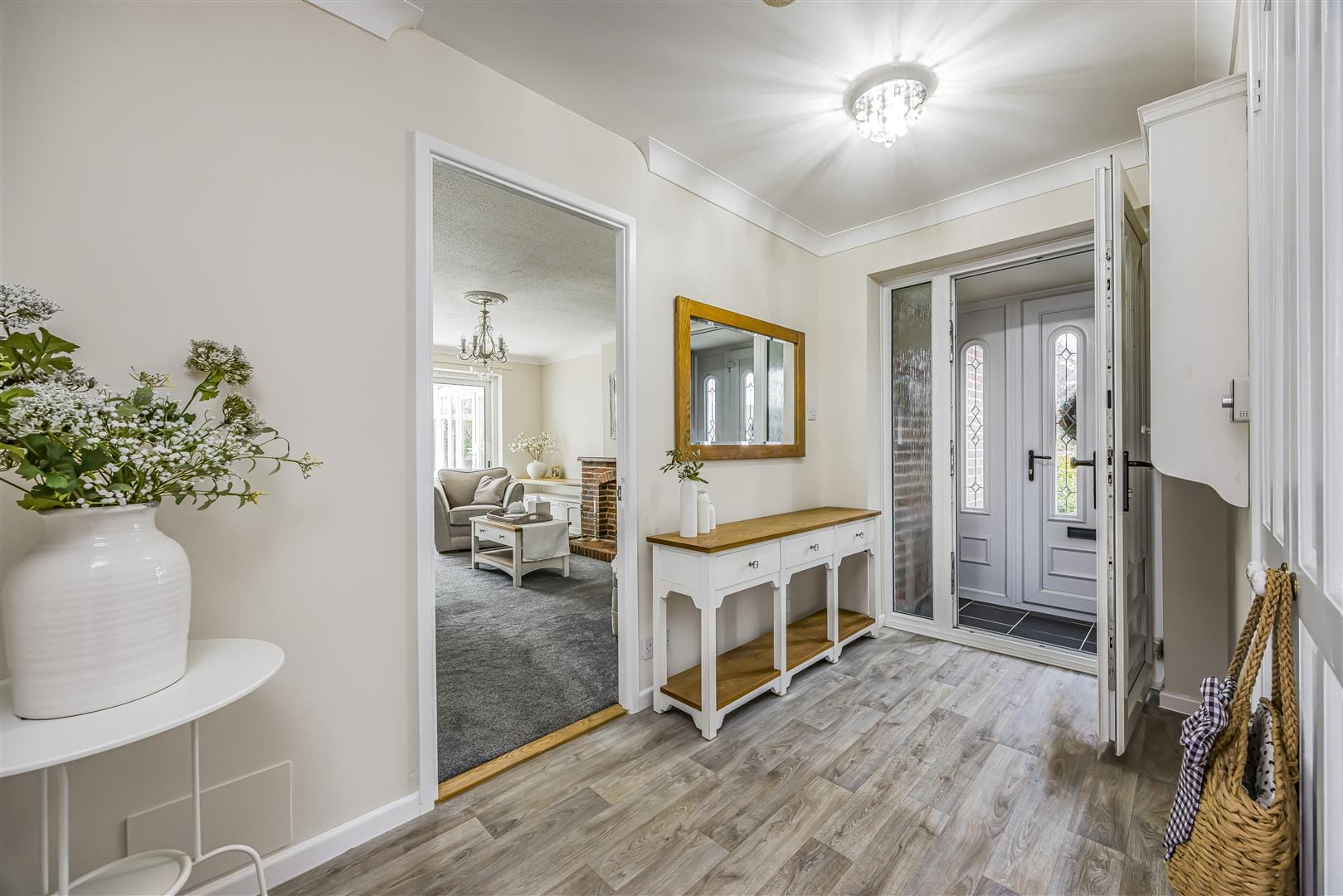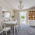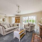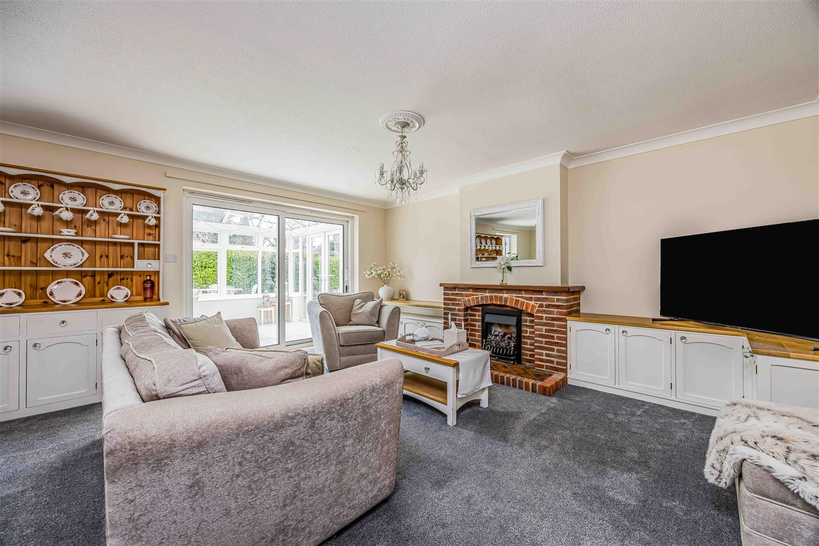 The property boasts an attractive cobbled pathway leading to a porch and a spacious central hallway, offering access to all main rooms and creating a welcoming first impression. At the heart of the home is an impressive open-plan living/dining room with a charming brick-built fireplace as a focal point. Double doors open to a light-filled conservatory with underfloor heating - ideal for relaxing or entertaining year-round while enjoying views of the picturesque south-facing garden. The kitchen, located adjacent to the dining area, includes a stylish butler sink with feature tap, and provides a practical layout with easy access from the hallway and seamless connectivity to the main living and entertaining spaces. The property offers three generous bedrooms: a main double, a further spacious double, and a versatile third bedroom - ideal for guests, a nursery, or office for those who work from home. All bedrooms benefit from built-in wardrobes, neutral décor, and stylish fitted shutters. A bright well-proportioned family bathroom completes the layout.