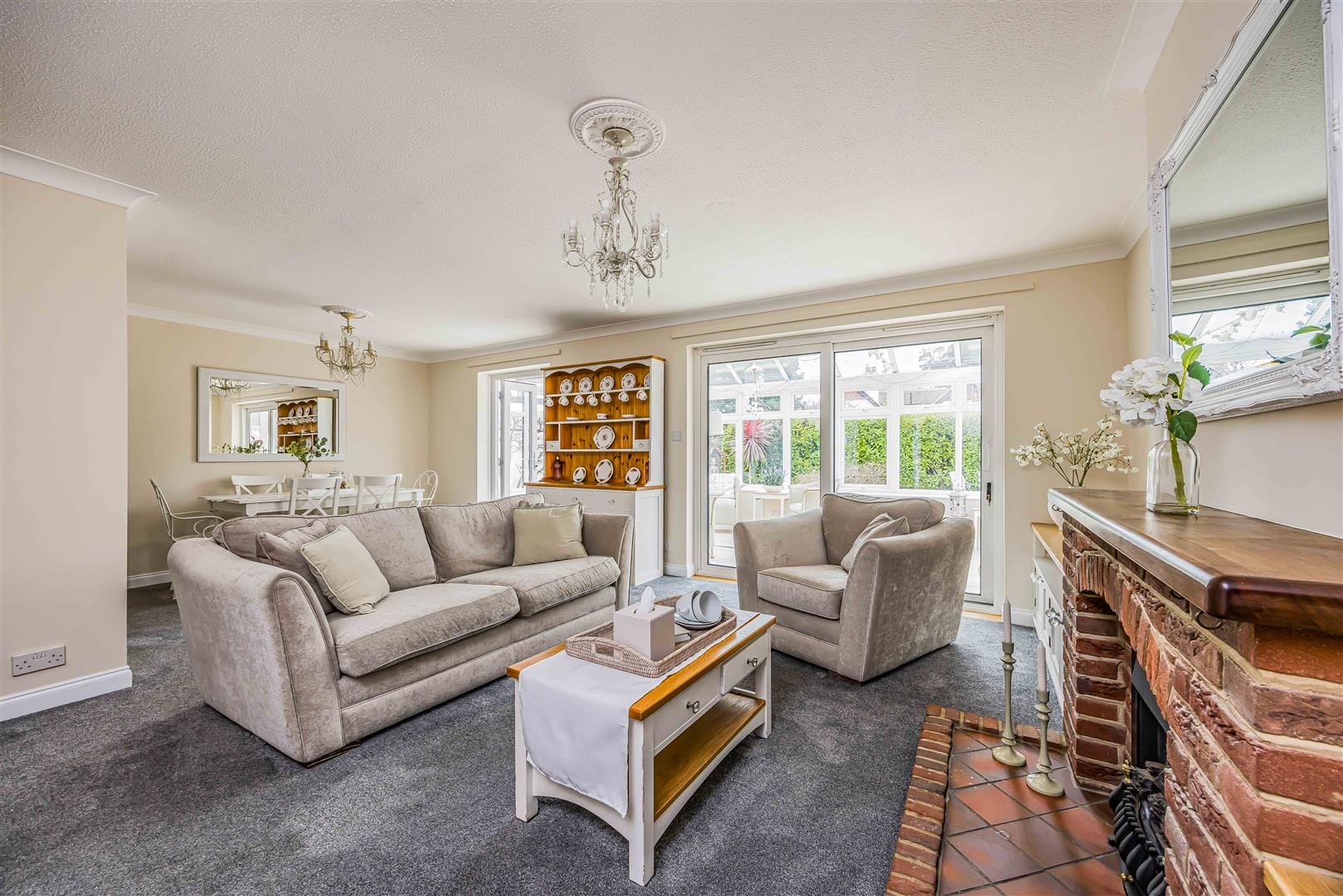 - Spacious open-plan living/dining room with feature brick fireplace