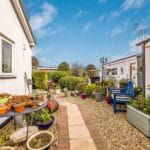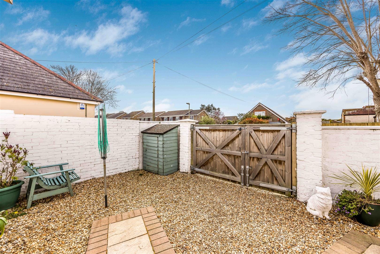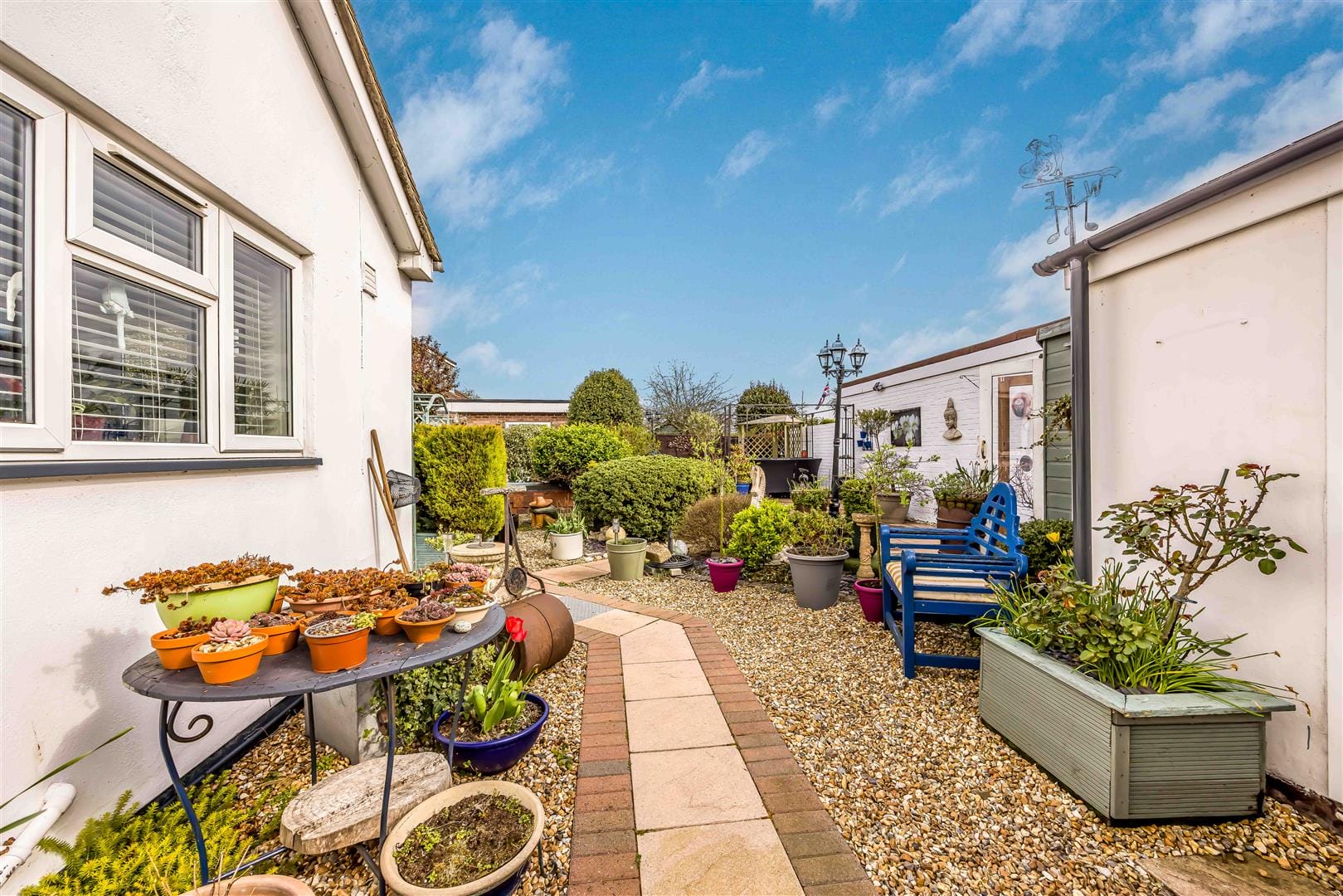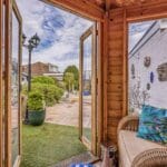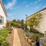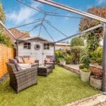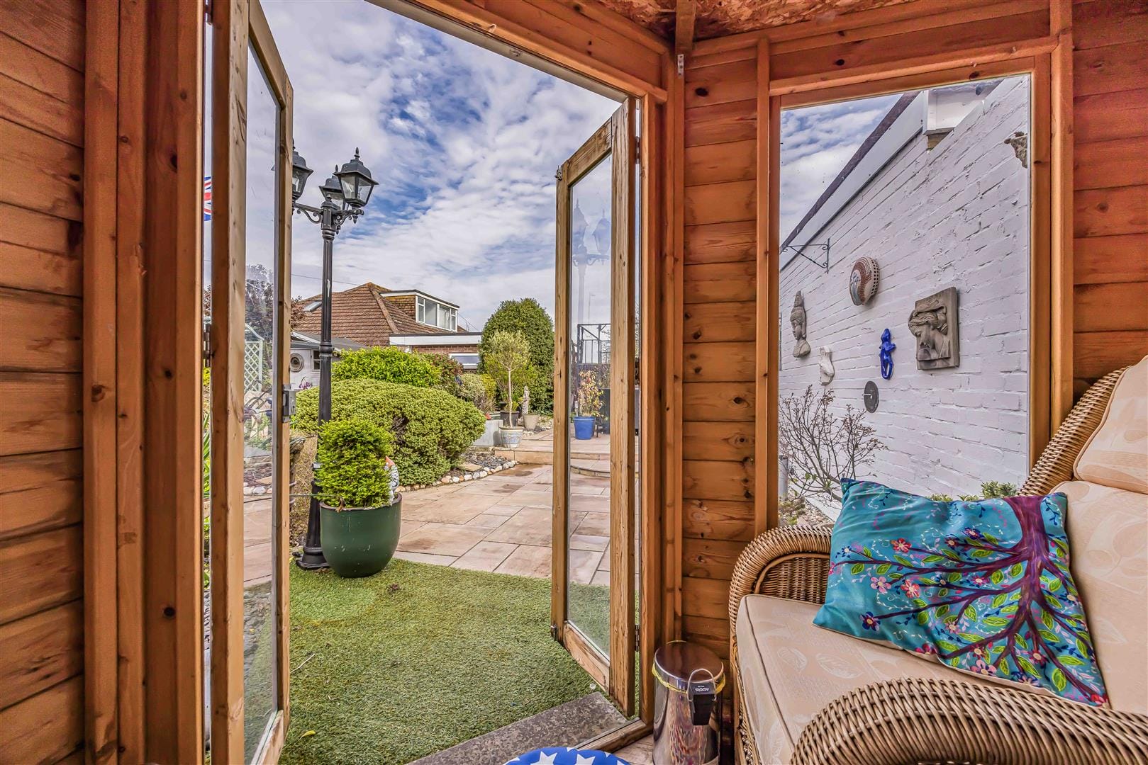 The rear sunny garden surrounds the north and east elevations of the property and features a paved patio, a pergola, summer house, workshop and mature plantings.